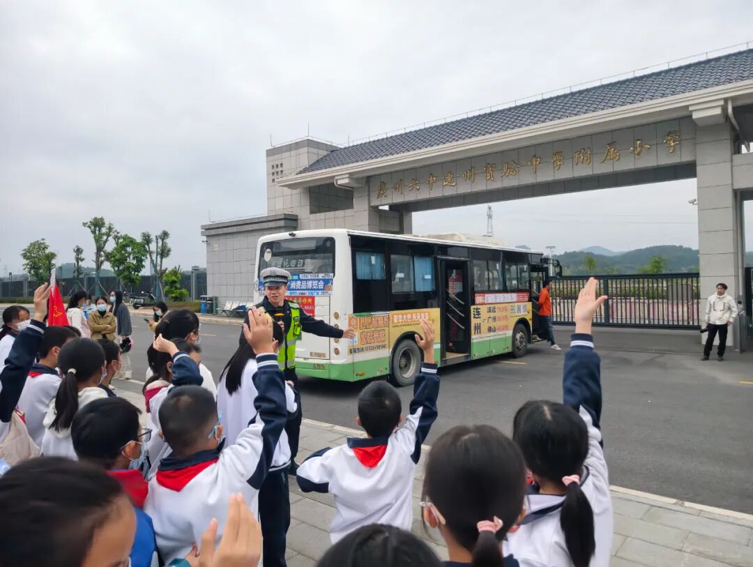 在广州六中连州实验学校附属小学,民警结合学生出行特点,讲解安全知识。通过实地体验公交车盲区、指导正确系安全带等方式,帮助学生“知危险、会避险”。