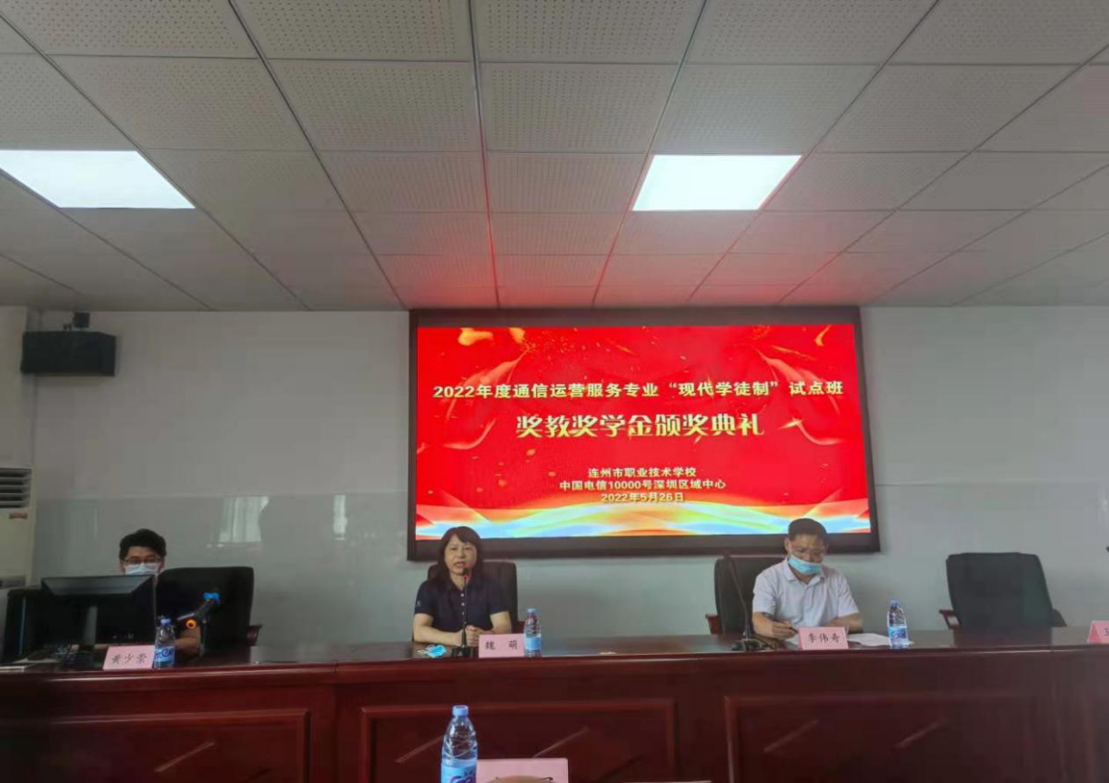 为进一步促进校企合作发展,引导鼓励学生奋发向上,刻苦学习,激励教师不断努力,扎实教学。2022年5月26日,连州市职业技术学校在综合楼607会议室举行2022年度通信运营服务专业现代学徒制试点班奖教奖学金颁奖典礼。中国电信10000号深圳区域中心魏萌经理、王盛栋主管,连州市职业技术学校校长李伟奇等相关领导、老师以及通信运营服务班的同学们参加了本次仪式。仪式由中国电信10000号深圳区域中心导师陈柯夫主持。