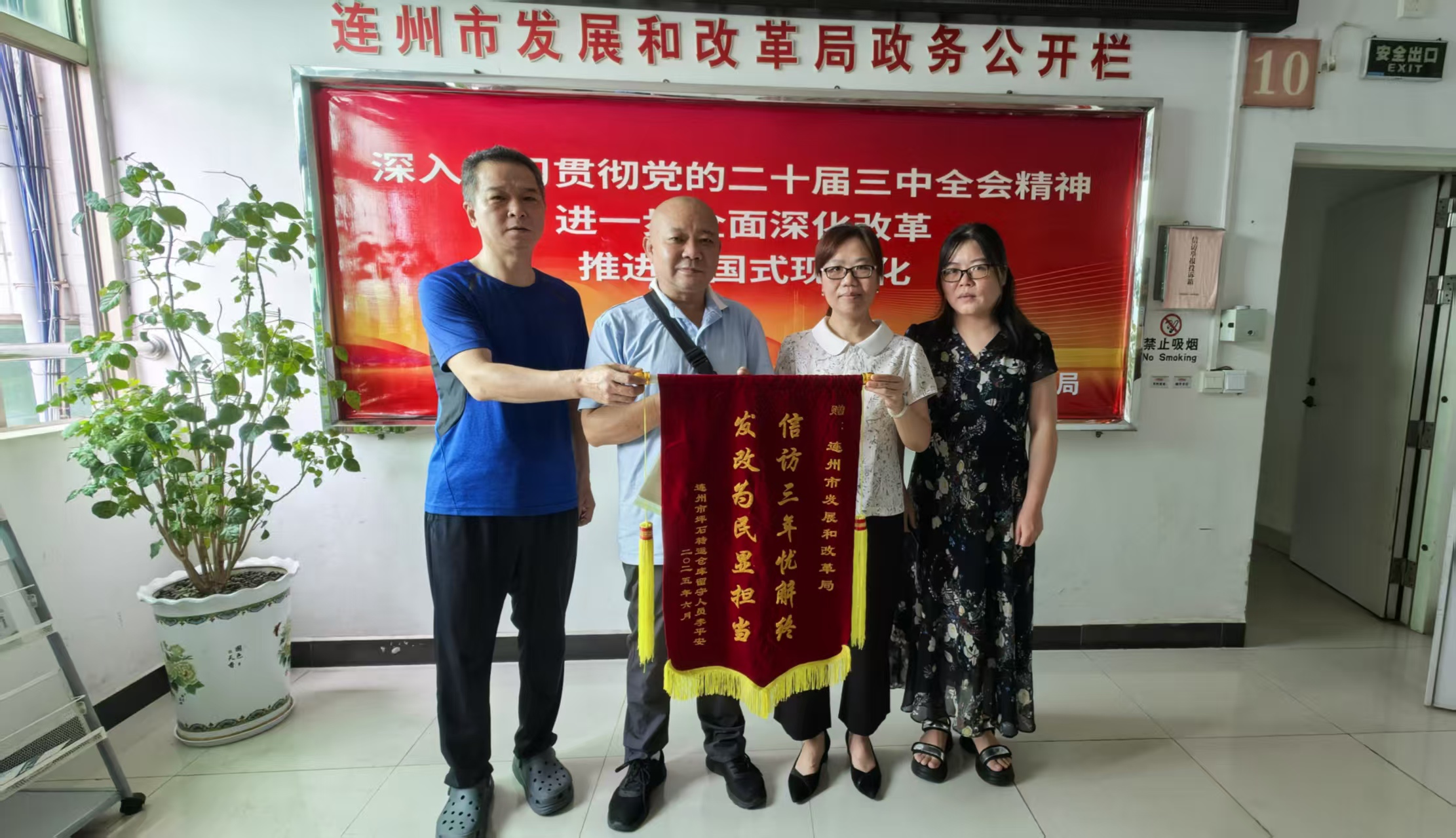 2025年7月1日,连州市发展和改革局出现了温馨的一幕。信访群众李平安满怀感激,将一面写有“信访三年忧解终 发改为民显担当”的锦旗,郑重地送到了信访工作人员手中,以此表达对发改局积极解决其诉求的诚挚感谢。这不仅是对信访工作的高度认可,更体现了我局对维护群众利益、化解社会矛盾工作的重视。