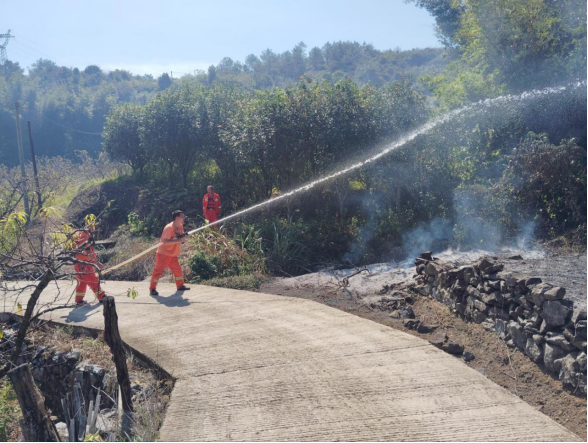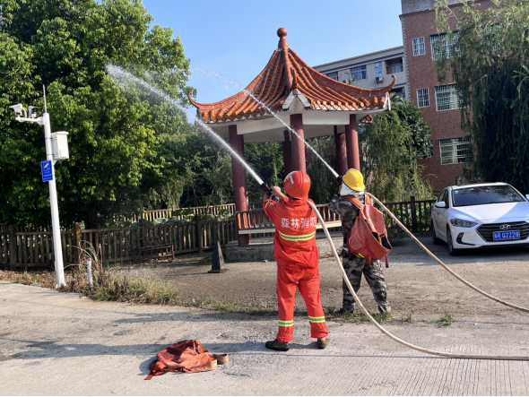 在实战演练方面,九陂镇在龙岗村成功模拟了一次山火扑灭演练。演练中,队员们迅速响应、协同作战,利用消防车辆和水枪等装备,对模拟的山火进行了有效的扑救。演练不仅检验了队伍受训成果,更在实战中锤炼了队伍的应急反应能力和协同作战能力。