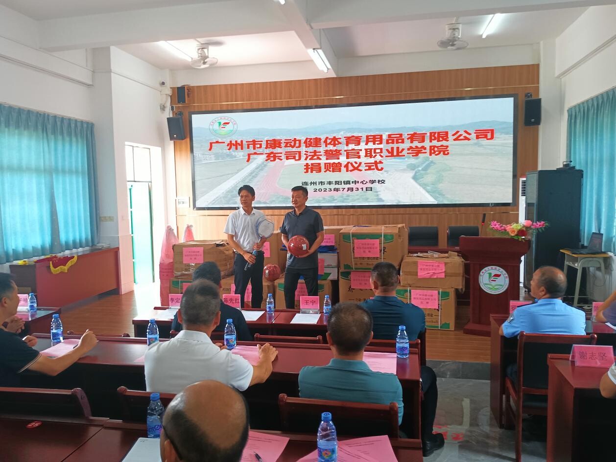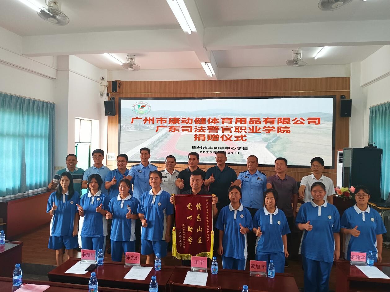 为支持乡村教育事业发展,助力乡村振兴战略。7月31日,在广东司法警官职业学院发起、广州市康动健体育用品有限公司的大力支持下,向丰阳镇中小学生捐赠体育器材仪式在丰阳镇中心学校举行。广州市康动健体育用品有限公司王宁总经理、广东司法警官职业学院李定忠教授、许余有副教授,连州市教育局黄旭华副局长、丰阳镇人民政府陈先红镇长、广东司法警官职业学院驻丰阳镇工作队成员以及丰阳镇中心学校师生代表参加了捐赠仪式。