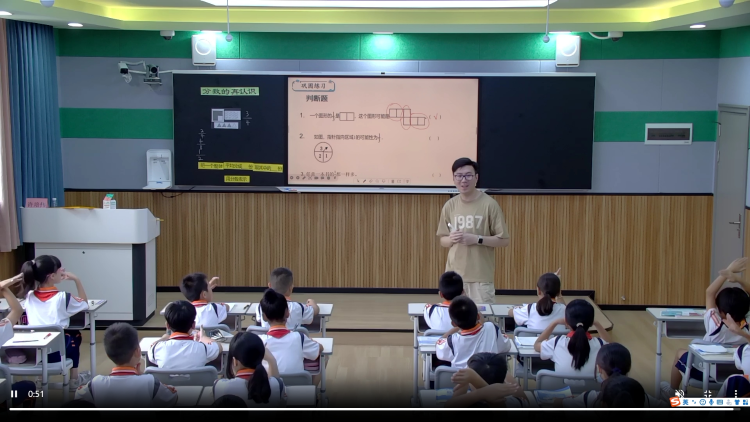 广州市荔湾区詹天佑小学的许培伟老师讲授的是北师大版小学数学五年级上册《分数的再认识》一课,属于“数与代数”领域“数与运算”主题的内容。课堂伊始,许老师创设了一个猜数游戏(把一个月饼平均分给50个同学,每人分到多少?),充分调动了学生的学习积极性,接着引导学生动手“分一分”“圈一圈”“涂一涂”等活动,从活动中获取丰富的感性认识,加深对“许多物体表示一个整体”的认识,引导学生一步一步地从具体的实例中逐步抽象归纳出分数的意义。本节课,许老师始终以学生为中心,充分发挥了学生的主体作用,通过创设具体的问题情境,丰富学生对分数的再认识,促进学生对分数的理解,体会分数的相对性,发展学生的数感,体会数学与生活的密切联系。