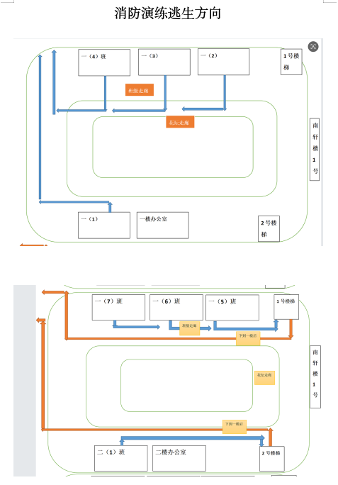 让疏散路线直观清晰,学校专项绘制《疏散路线三维示意图》,精准划分南轩一、南轩二教学楼各教室的逃生路径,明确标注楼梯行进方向、转弯避让节点及运动场集结区域,从源头上规避拥堵风险。