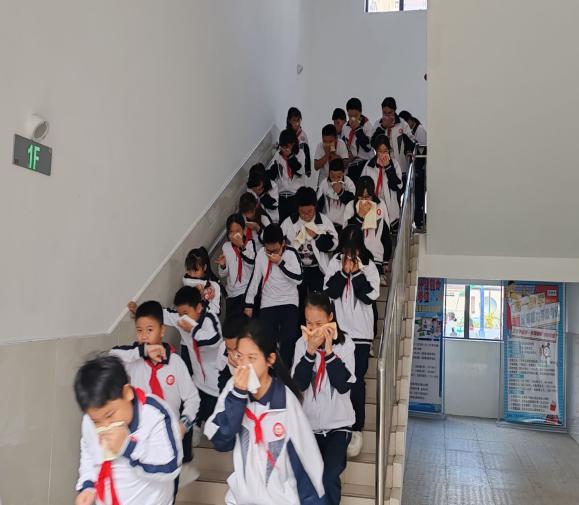 首先各班主任采用“示范+模拟+问答”三步教学法开展前置宣教:现场演示“沾湿毛巾对折三层捂口鼻、身体前倾60°躬身、步幅不超30厘米快步走”的标准动作;组织学生在教室开展预演,逐人纠正“捂鼻不严、躬身角度不足”等问题;通过“火灾时能否坐电梯”“浓烟中如何判断安全出口”等互动问答巩固常识,让安全规范从“知晓”转化为“熟练掌握”。