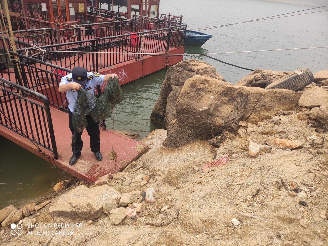 巡查过程中,重点查看了谭岭水库禁渔期渔船集中停靠、救生安全设备是否齐全,以及网具封存、“禁渔期禁止捕捞”警示标识设置情况。莫小坚同志提出要进一步加强渔船和乡镇自用船舶管理,提高渔民安全意识,压实渔船船主安全生产主体责任,严禁渔船、乡镇自用船舶非法载人载客,同时,执法人员还向当地村民宣传禁渔期制度相关法律法规。此次行动现场缴获地笼8只,放生渔获物3公斤左右,现场未发现违法行为实施人员。