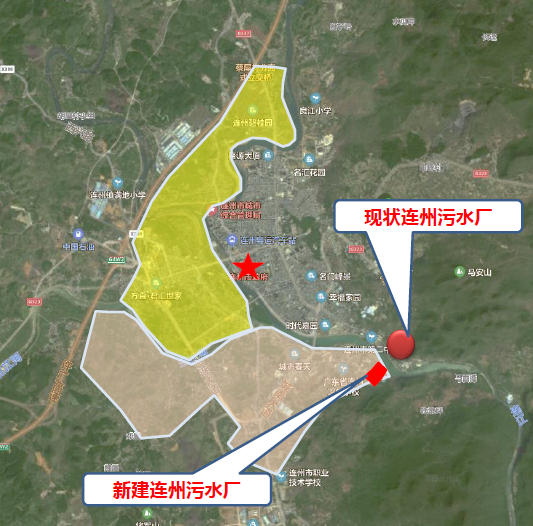 服务范围:包括新城区,城南片区,总纳污范围1139.4公顷。其中,新城区,连江西侧纳污范围531.29公顷;城南片区,连江西南侧,纳污范围608.11公顷。新建污水处理厂位置示意图及纳污范围 见图1。