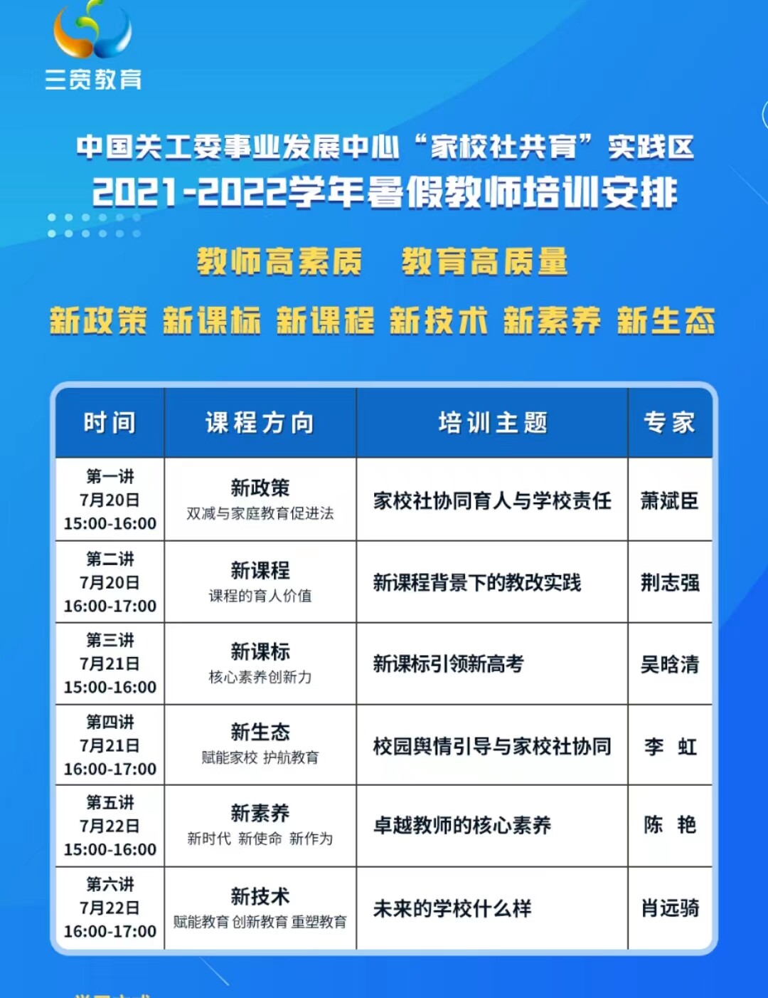 本次培训课程为期三天(7月20日—22日,每天15:00—17:00),由北京三宽教育科学研究院承担,培训会以萧斌臣老师的《新政策:家校社协同育人与学校责任》、吴晗清老师的《新课标:新课标引领新高考》、李巍老师的《新课程:师生关系具有不可思议的力量》、肖远骑老师的《新技术:未来的学校什么样》、陈艳老师的《新素养:卓越教师的核心素养》、李虹老师的《新生态:校园舆情管理与家校社协同》等主题展开。专家们的讲授精彩不断,有高度、有广度、有内涵、有外延,以理论知识联系实际案例,指明家校社共育和家长学校建设是现代教育发展的必由之路。