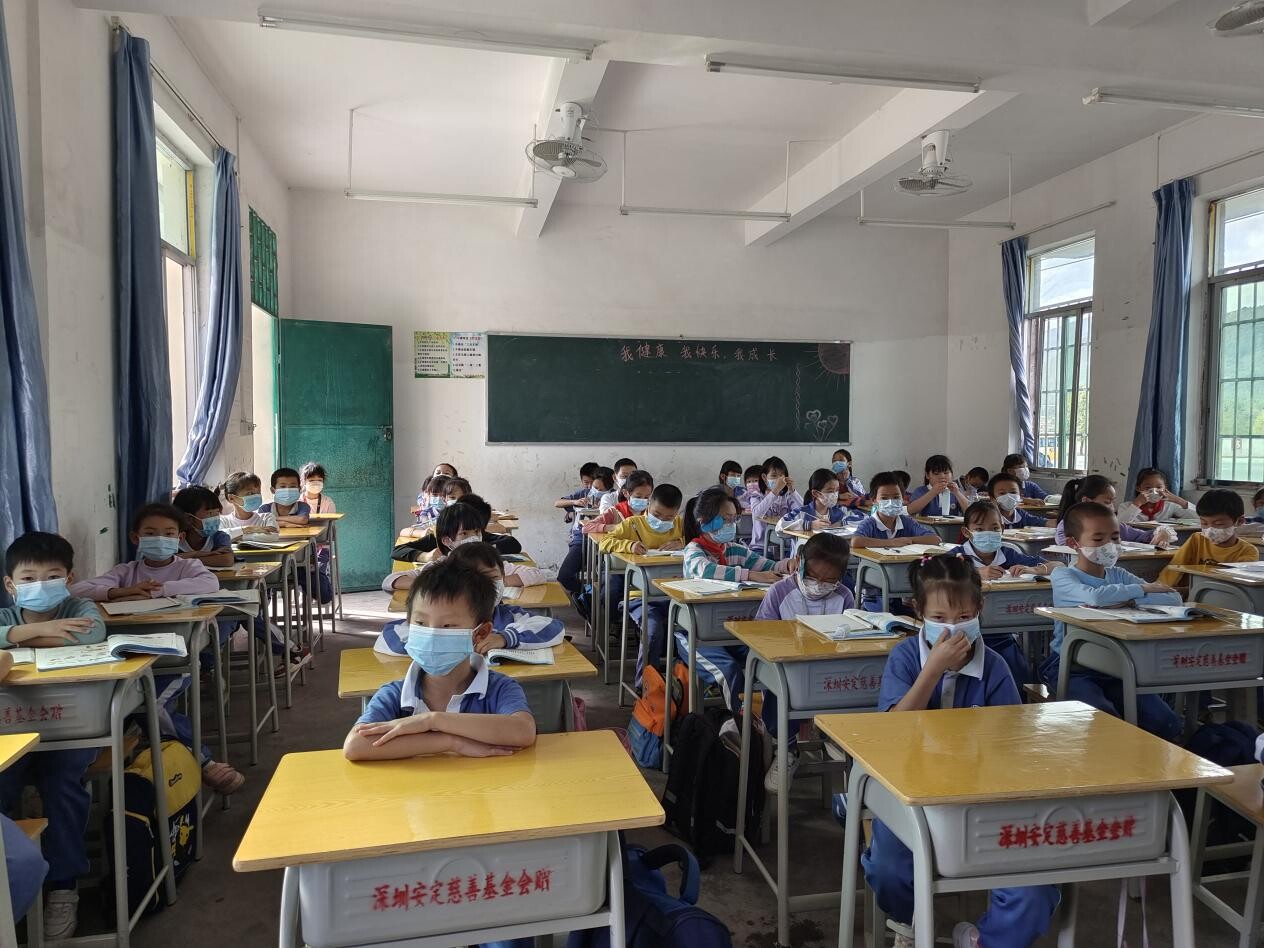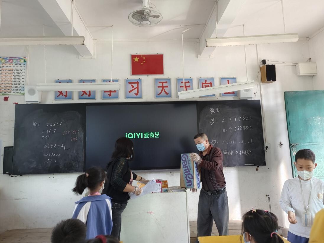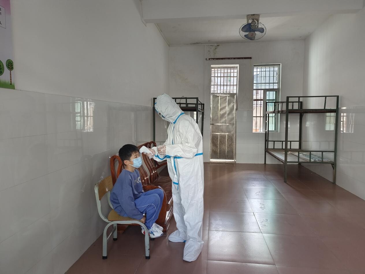 学生做完核酸后回到班级,由黎建卫老师负责采集场所布置,给学生发放应急物资,并与学校保安维持采集室秩序。
