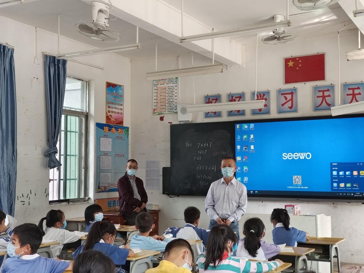 学生迅速回到课室,班主任给学生发放核酸检测码和备用口罩,维持班级秩序,并播放疫情防控知识宣传片。
