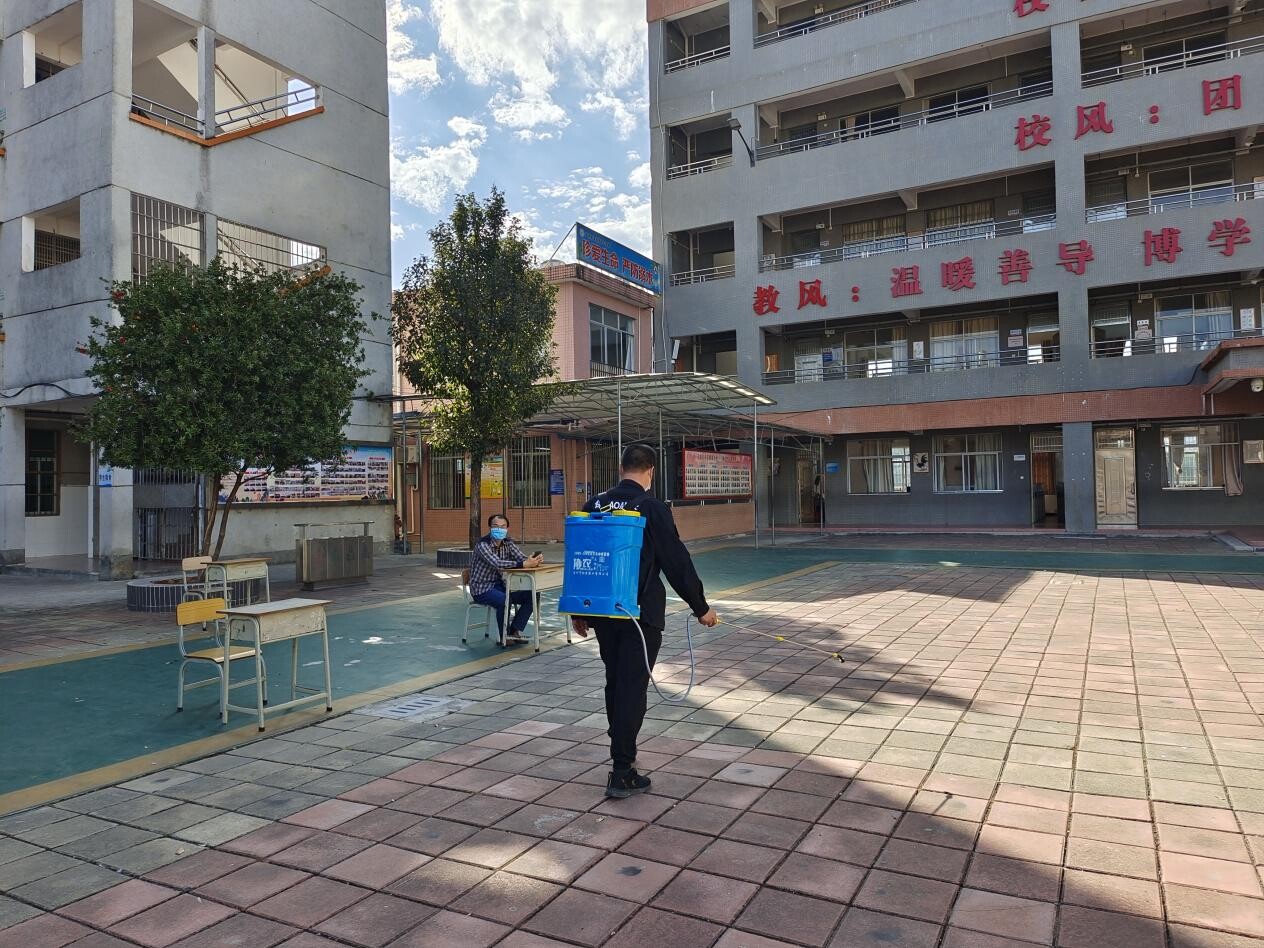 最后,由吴卫东老师组织学校保安迅速到相关区域进行消杀工作。