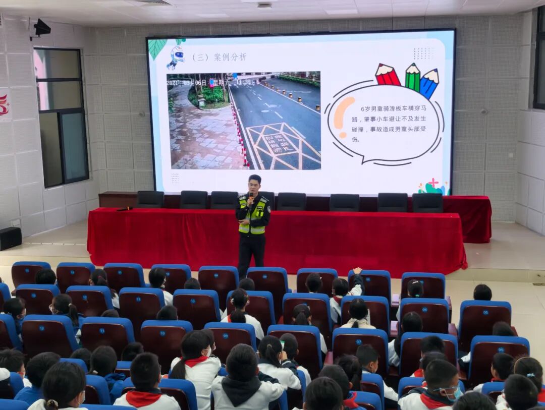 在广州六中连州实验学校附属小学,民警结合学生出行特点,讲解安全知识。通过实地体验公交车盲区、指导正确系安全带等方式,帮助学生“知危险、会避险”。