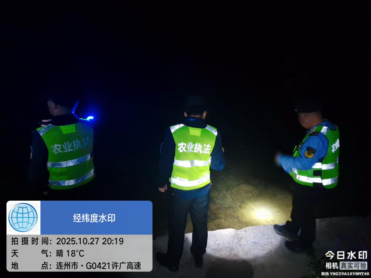 为切实保护水域生态环境和渔业资源,维护正常渔业生产秩序,严厉打击“电毒炸”鱼和非法捕捞违法犯罪行为,保护我市渔业资源和水生生态环境。2025年10月27日晚上19点至24点,连州市农业农村局莫小坚副局长带队,对连州市星子河新陂洞河段和星子河麻步河段开展岸线巡查,通过"车和人陆上巡,无人机水上巡"相结合的方式开展渔政执法专项巡查行动,在强化执法威慑和法制宣传的基础上,让非法捕捞人员和船只无处遁形。经巡查,发现疑似非法电鱼作业人员1名,嫌疑人驱车逃逸。